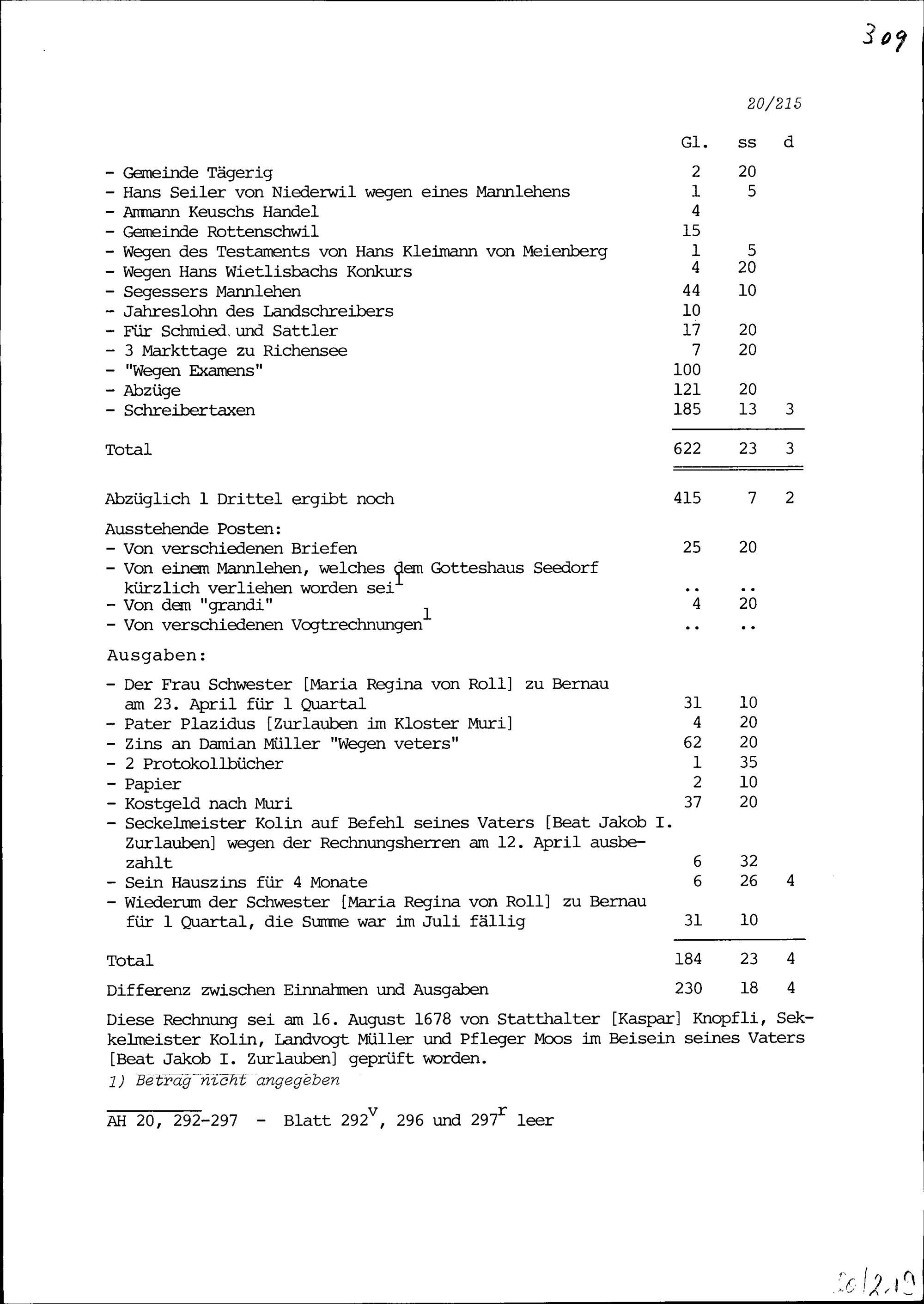 Einnahmen und Ausgaben der Landschreiberei der Freien Ämter vom März bis zum Sankt...