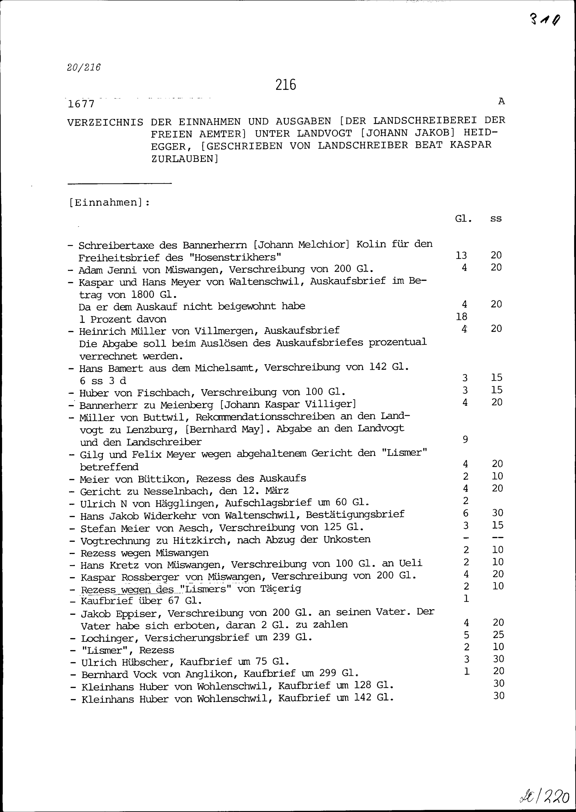 Einnahmen und Ausgaben der Landschreiberei der Freien Ämter unter Johann Jakob Heidegger, Landvogt, geschrieben von Beat Kaspar Zurlauben, Landschreiber