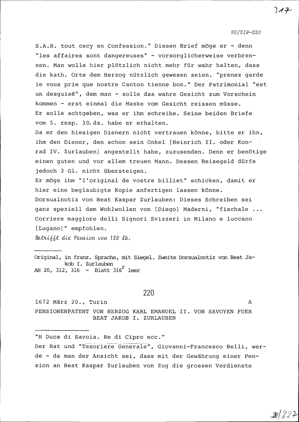 Pensionenpatent von Karl Emanuel II., Herzog von Savoyen, für Beat Jakob I. Zurlauben
