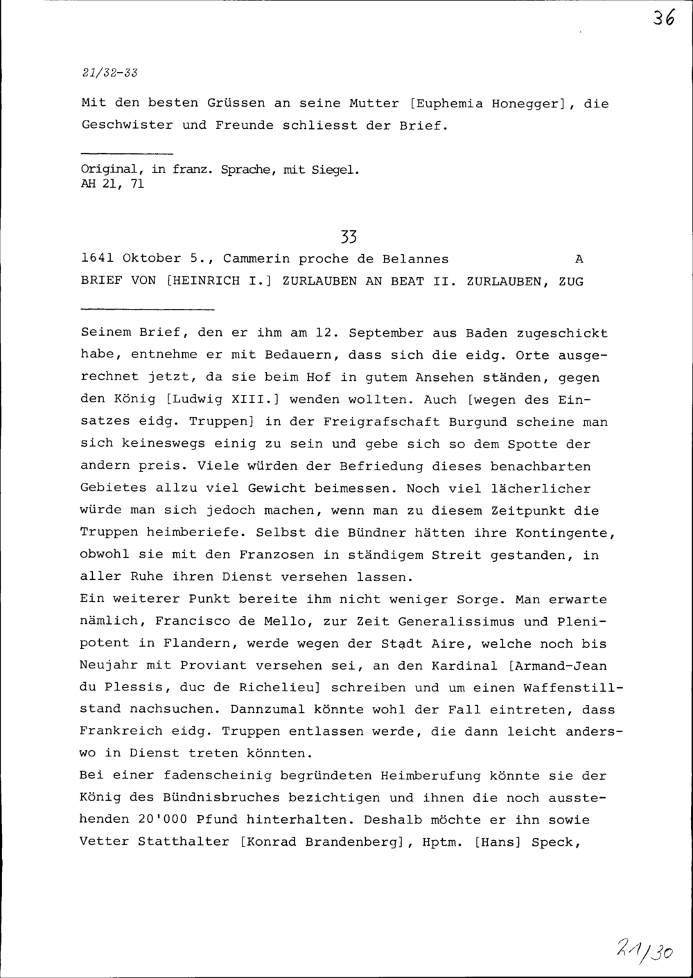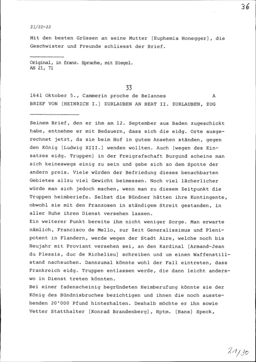 Schreiben von Heinrich I. Zurlauben an Beat II. Zurlauben, Zug
