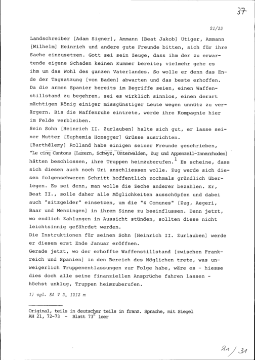 Schreiben von Heinrich I. Zurlauben an Beat II. Zurlauben, Zug