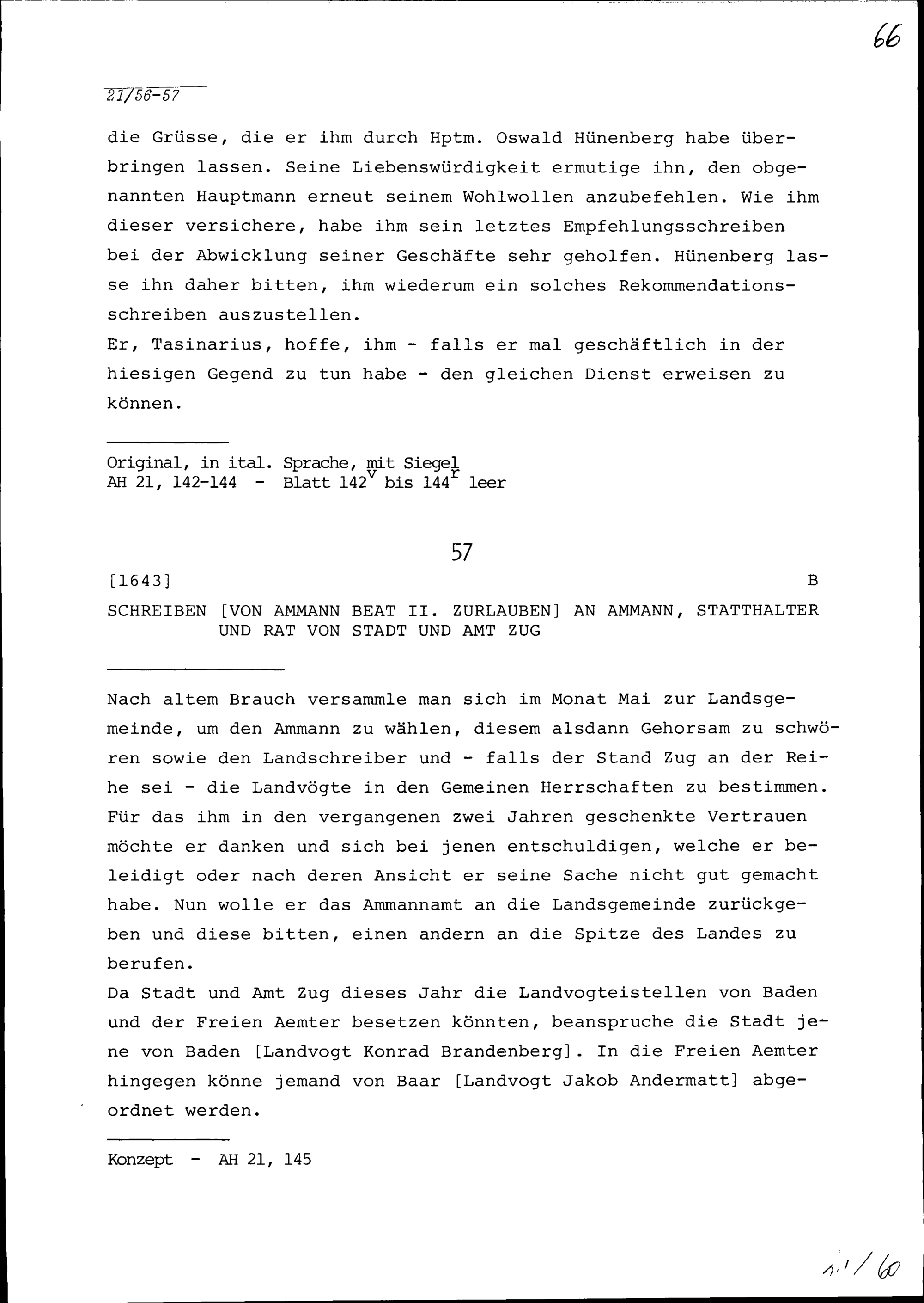 Schreiben von Beat II. Zurlauben, Ammann, an Ammann, Statthalter und Rat von Stadt und Amt Zug