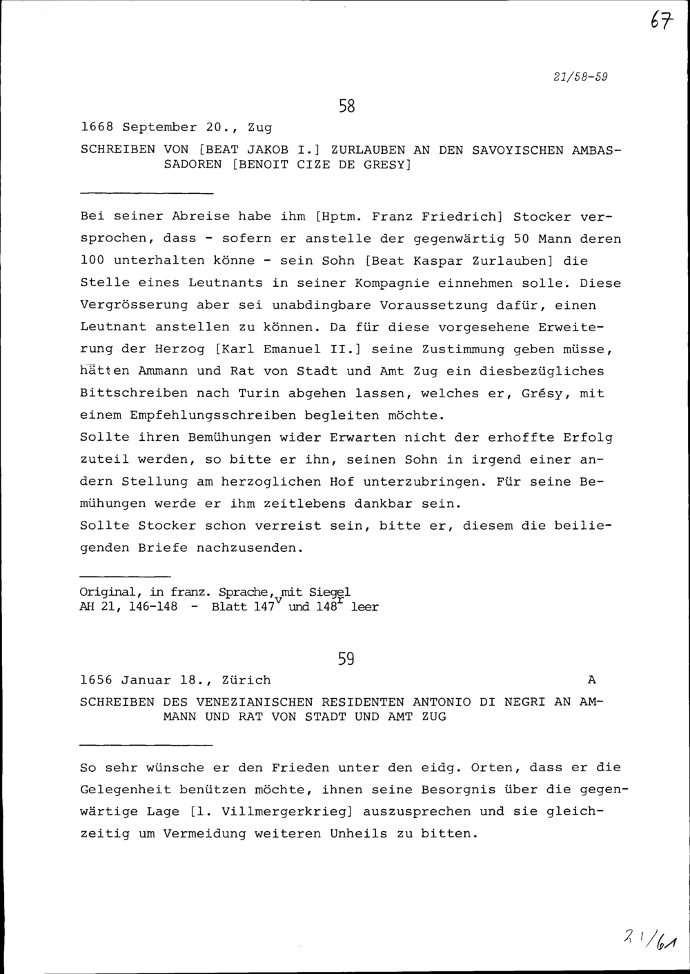 Schreiben von Beat Jakob I. Zurlauben an Benoît II. Cize de Grésy, Ambassador von Savoyen