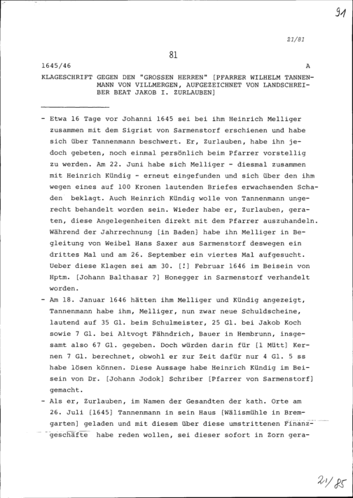 Klageschrift gegen Wilhelm Tannenmann von Villmergen, den "Grossen Herren" und Pfarrer, aufgezeichnet von Beat Jakob I. Zurlauben, Landschreiber