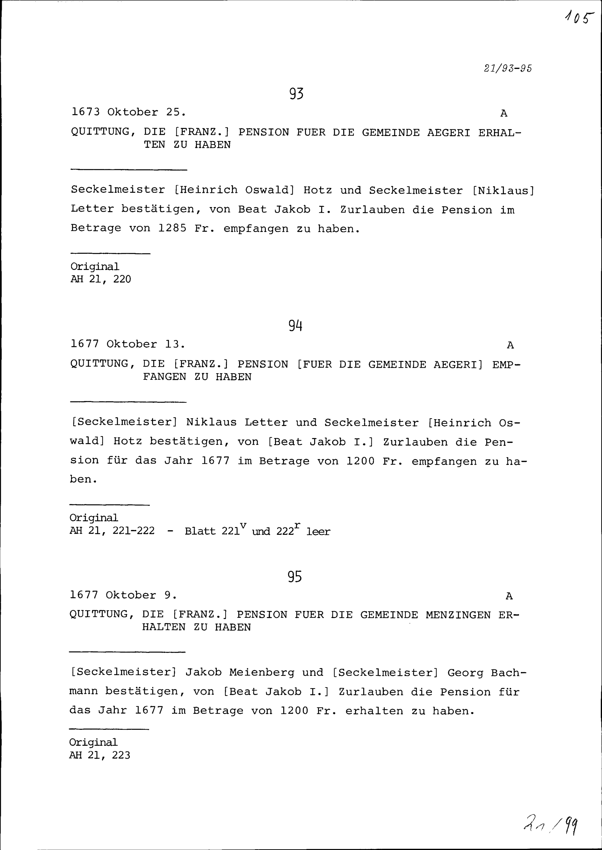 Quittung, die französische Pension für die Gemeinde Ägeri erhalten zu haben