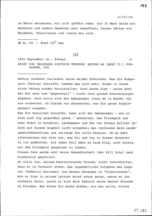 Schreiben von Wolfgang Dietrich Theodor Reding an Beat II. Zurlauben, Zug