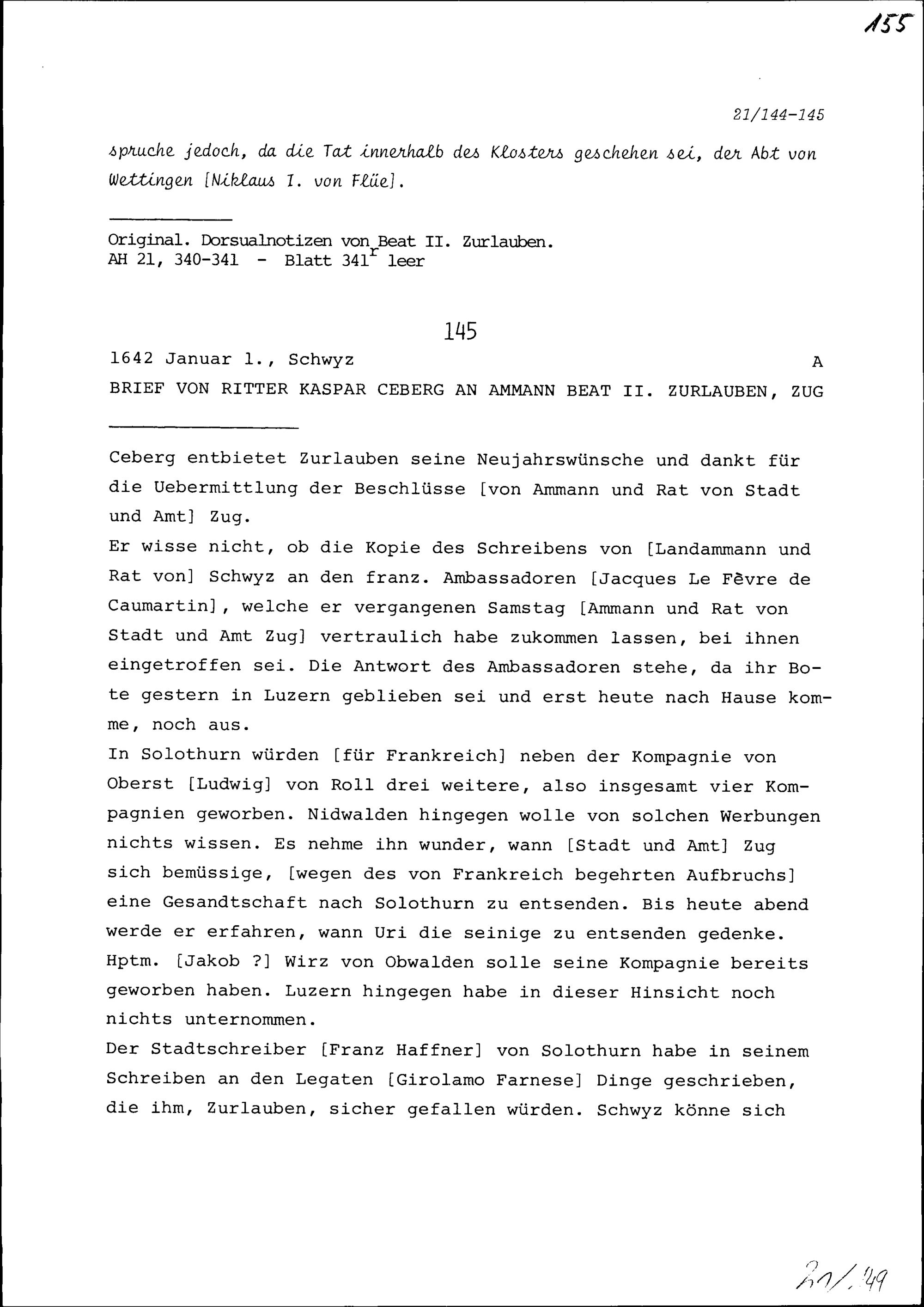 Schreiben von Kaspar Ceberg an Beat II. Zurlauben, Ammann, Zug
