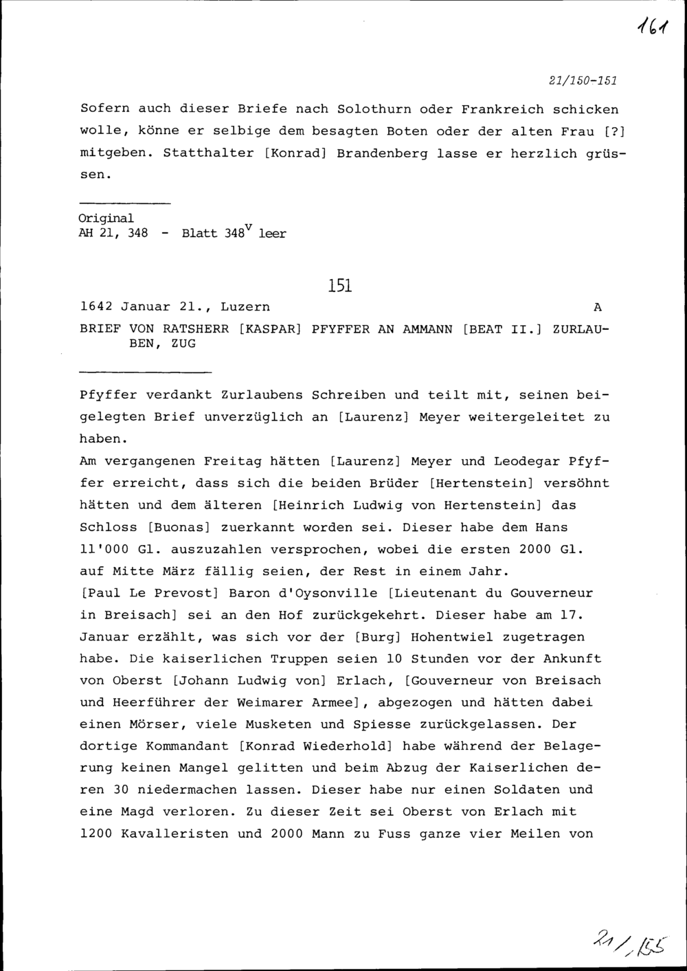 Schreiben von Kaspar Pfyffer, Ratsherr, an Beat II. Zurlauben, Ammann, Zug