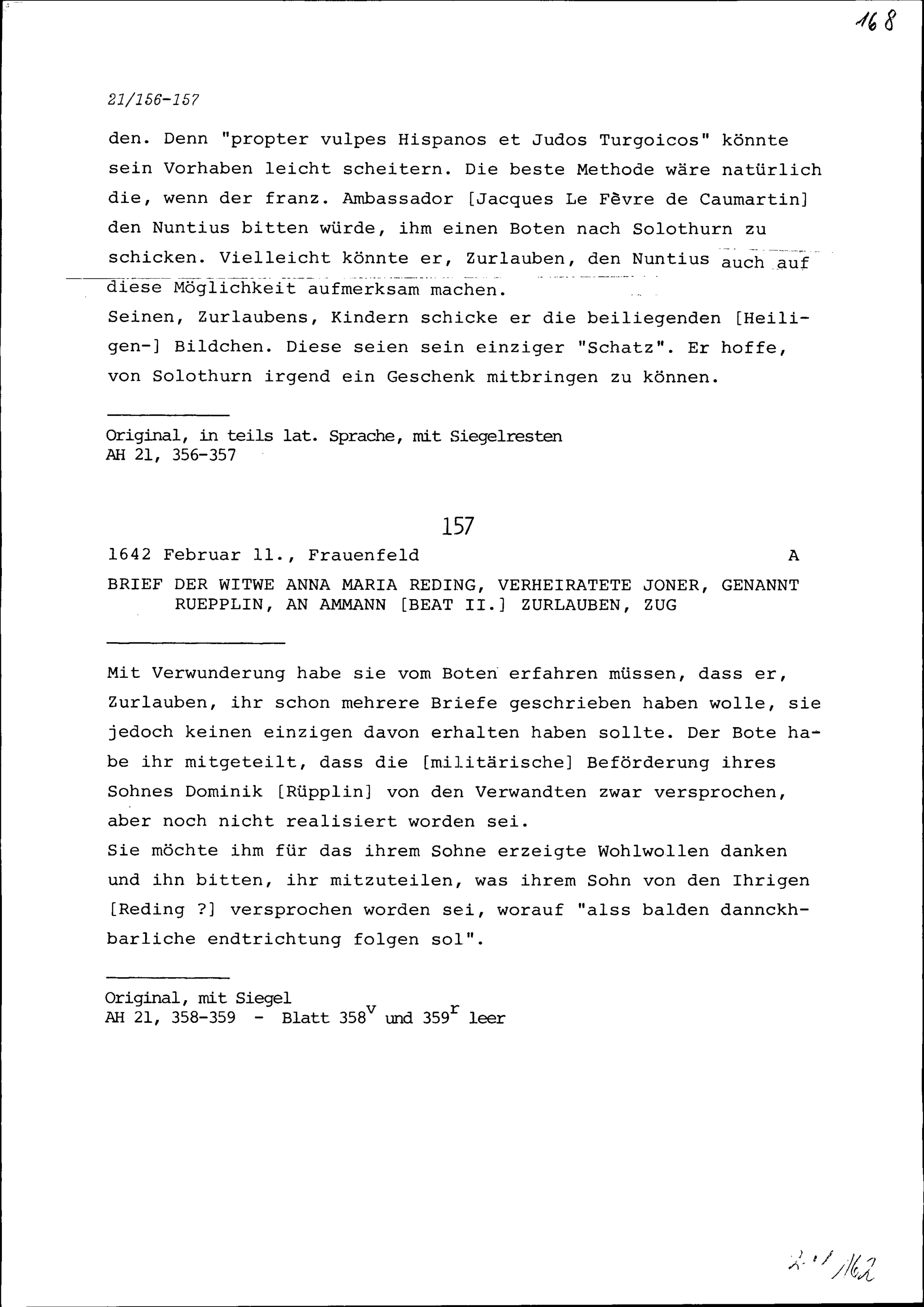 Schreiben von Anna Maria Reding, Witwe und verheiratete Joner, genannt Rüpplin, an Beat II. Zurlauben, Ammann, Zug