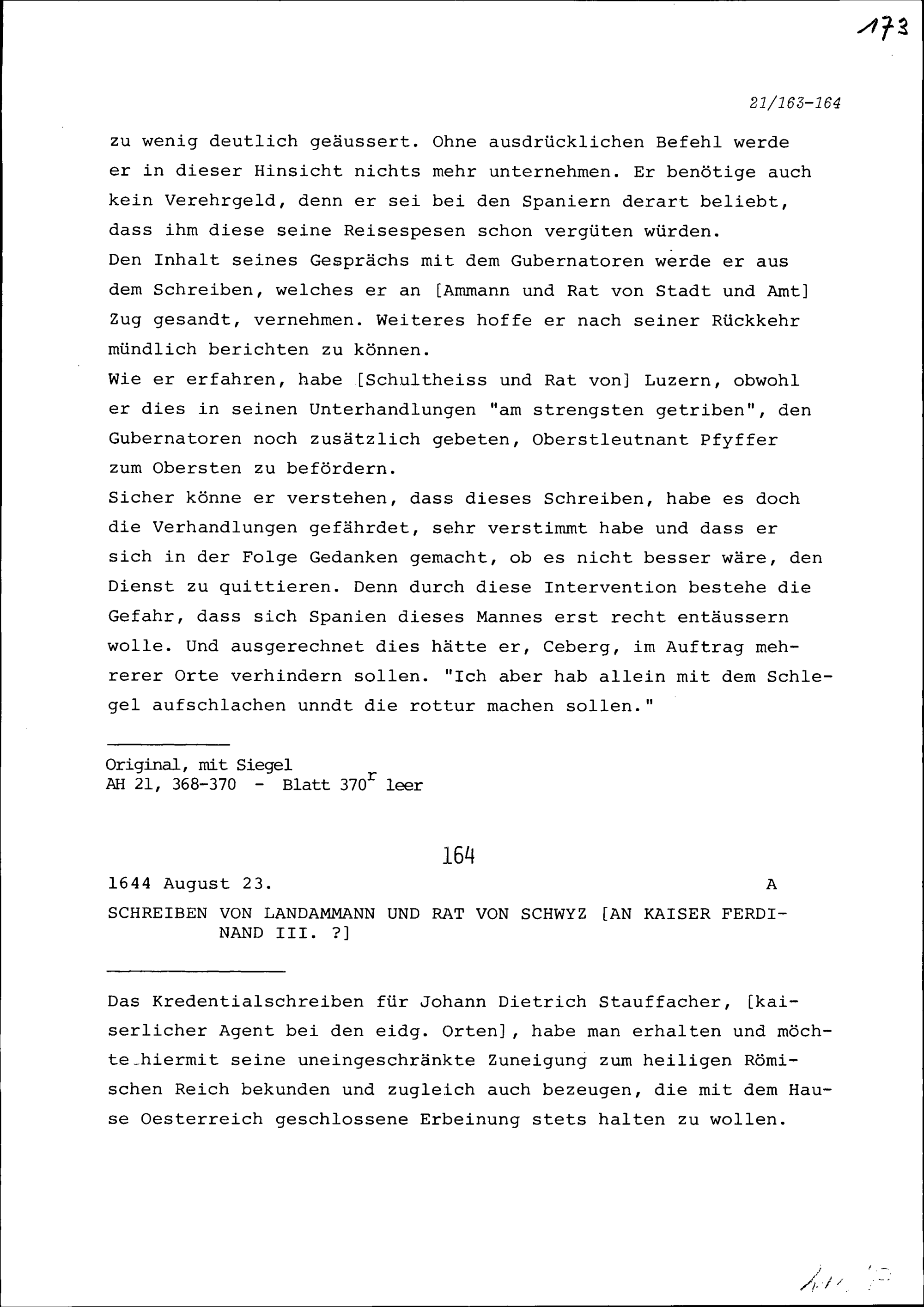 Schreiben des Landammanns und Rats von Schwyz an Ferdinand III., Kaiser
