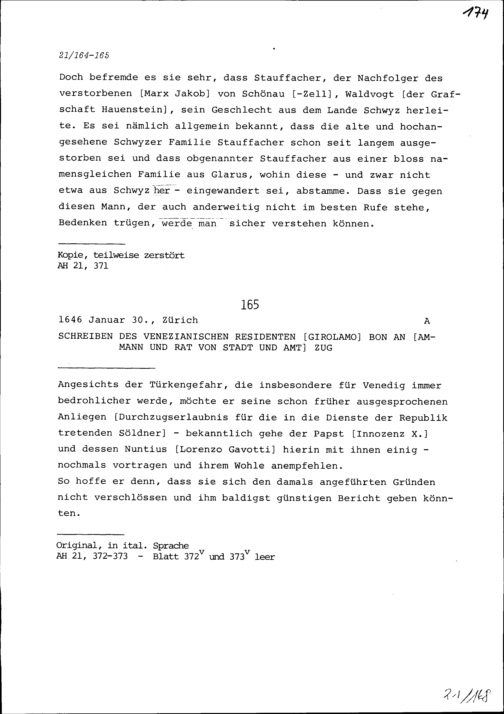 Schreiben von Girolamo Bon, Resident von Venedig, an Ammann und Rat von Stadt und Amt Zug