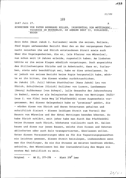 Schreiben von Bernhard Keller, Benediktinerpater von Wettingen, Vikar in Würenlos,...