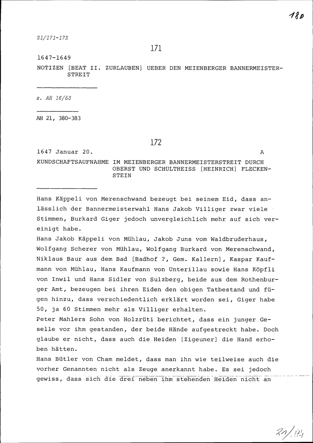 Notiz von Beat II. Zurlauben über den Meienberger Bannermeisterstreit
