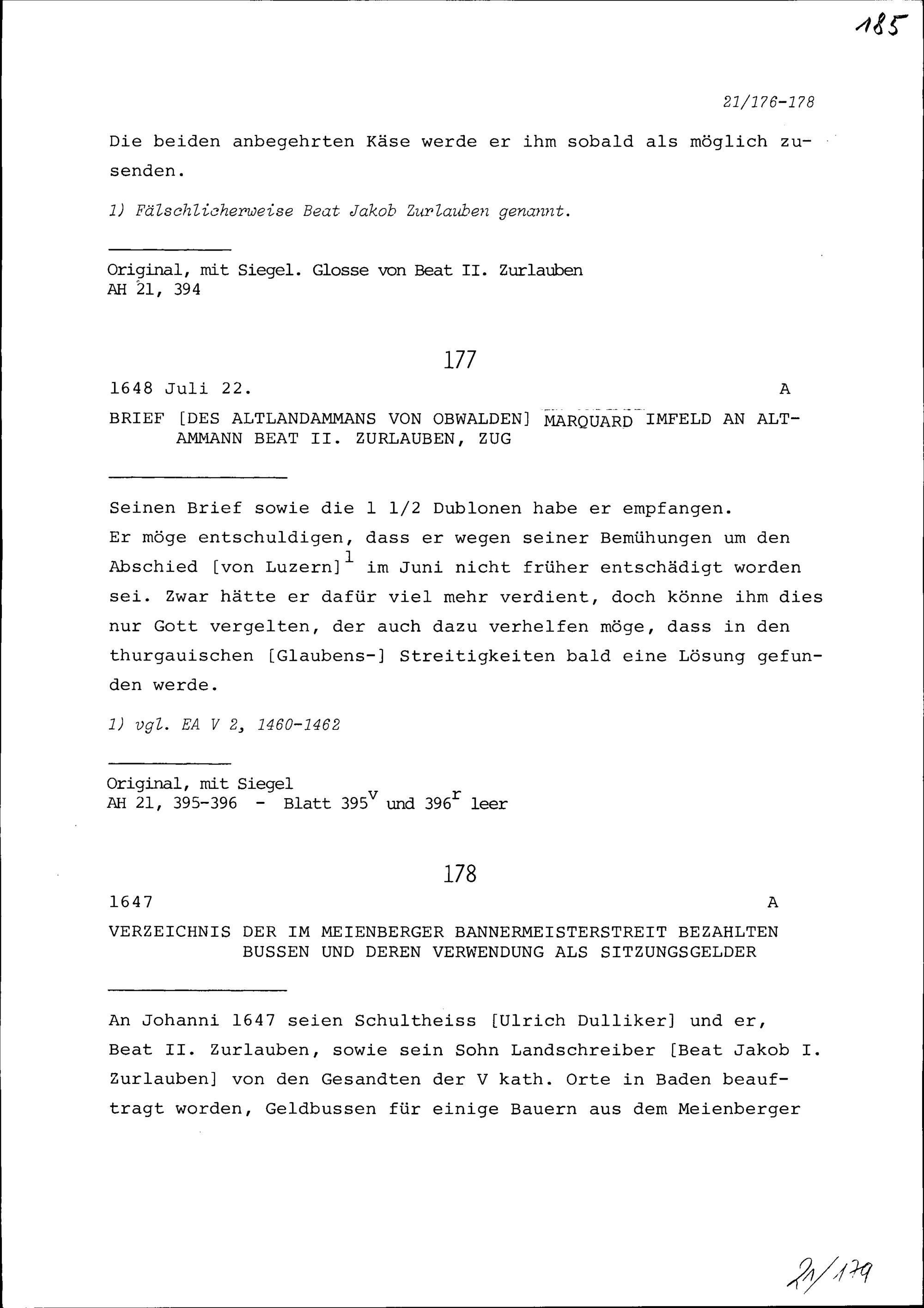 Schreiben von Marquard Imfeld, Altlandammann von Obwalden, an Beat II. Zurlauben, Altammann, Zug