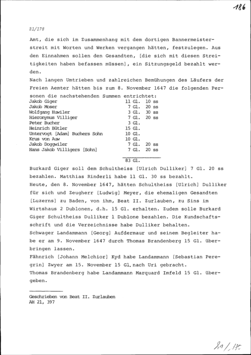 Liste der im Meienberger Bannermeisterstreit bezahlten Bussen und deren Verwendung als Sitzungsgelder