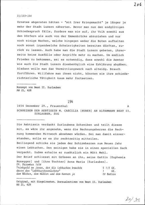 Schreiben von Maria Cäcilia Huber, Äbtissin, an Beat II. Zurlauben, Altammann, Z...