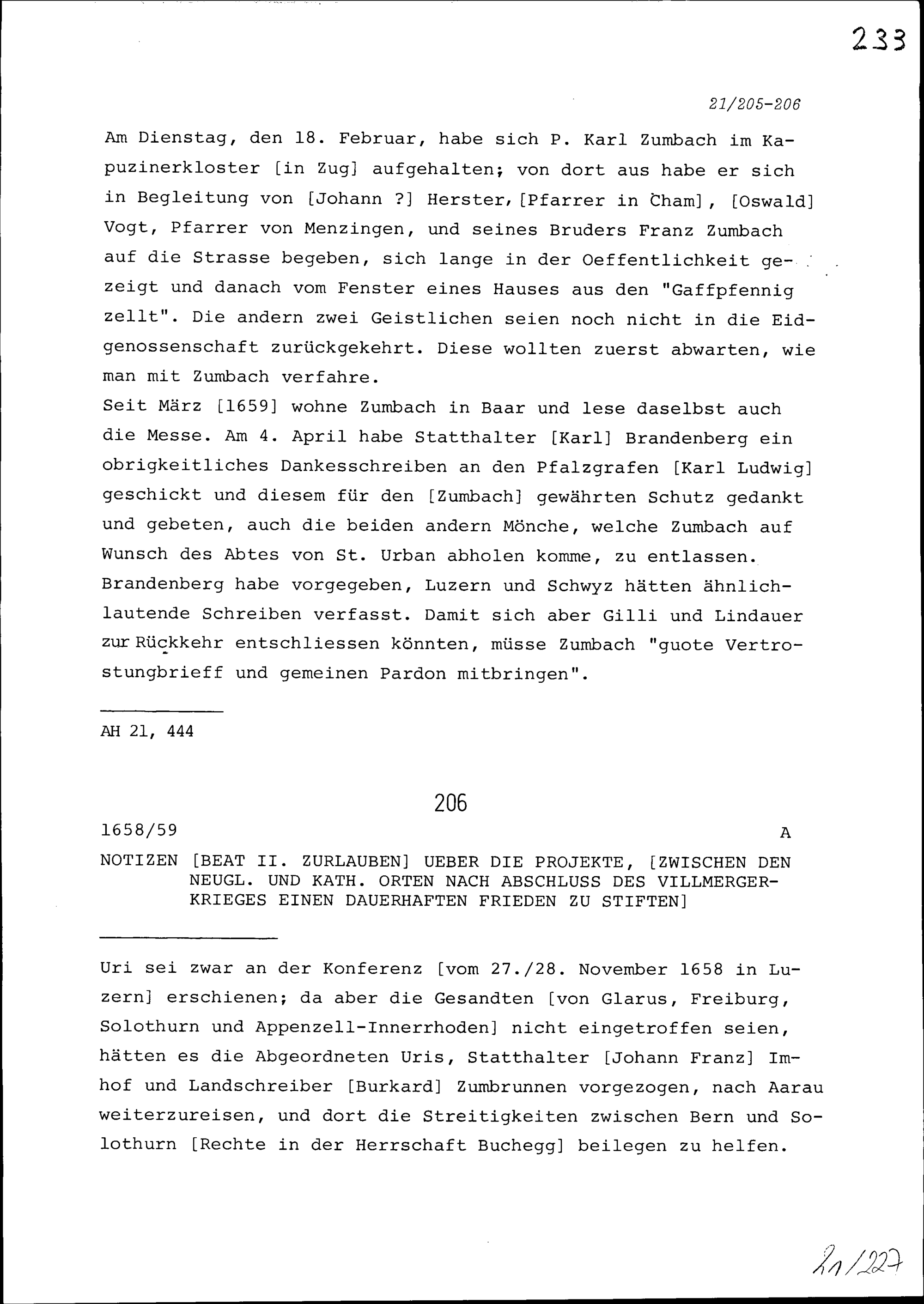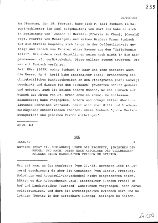 Notiz von Beat II. Zurlauben über die Projekte, zwischen den Neugläubigen und Katholischen...