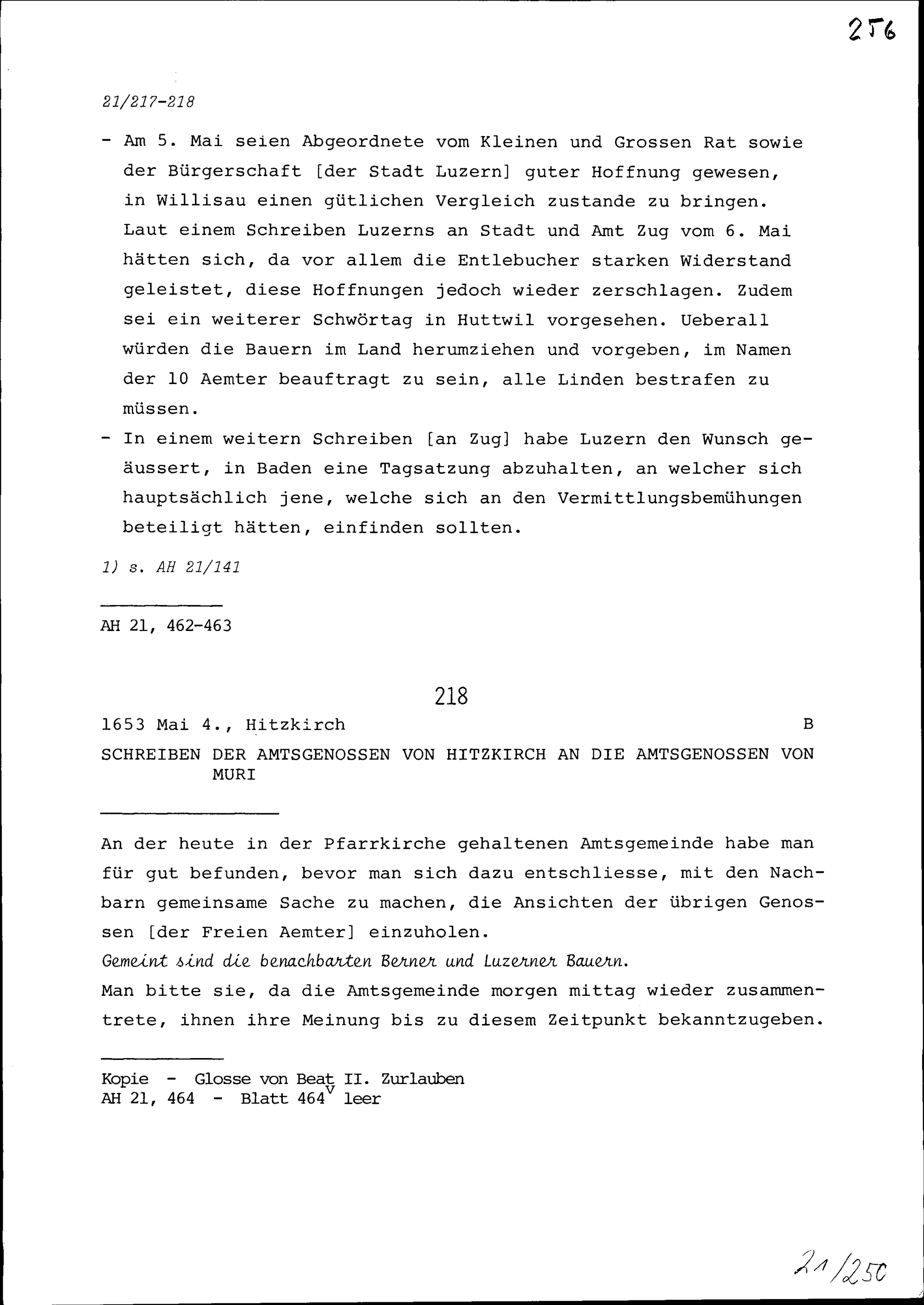 Schreiben der Amtsgenossen von Hitzkirch an die Amtsgenossen von Muri