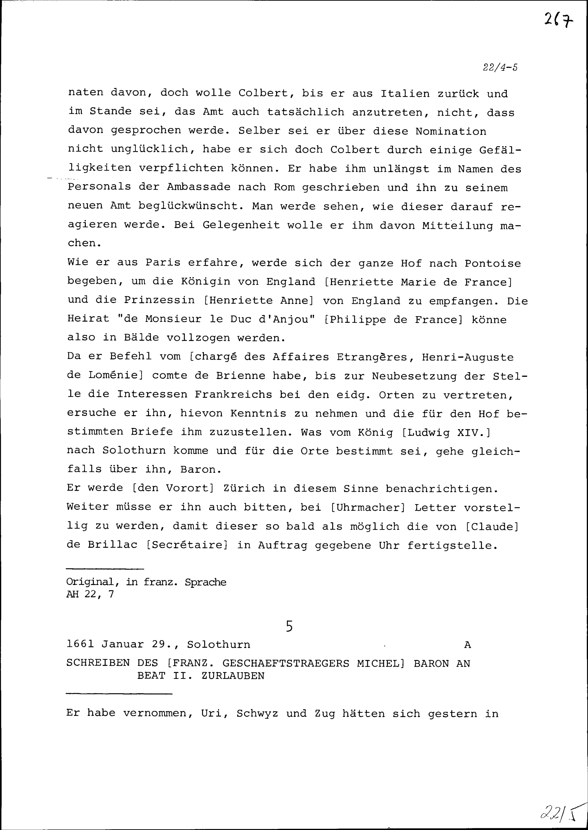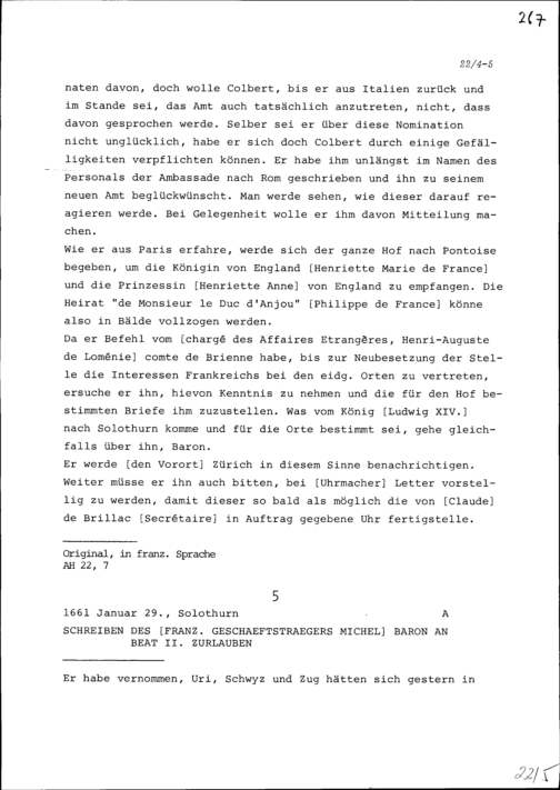 Schreiben von Michel Baron, französischer Geschäftsträger, an Beat II. Zurlauben
