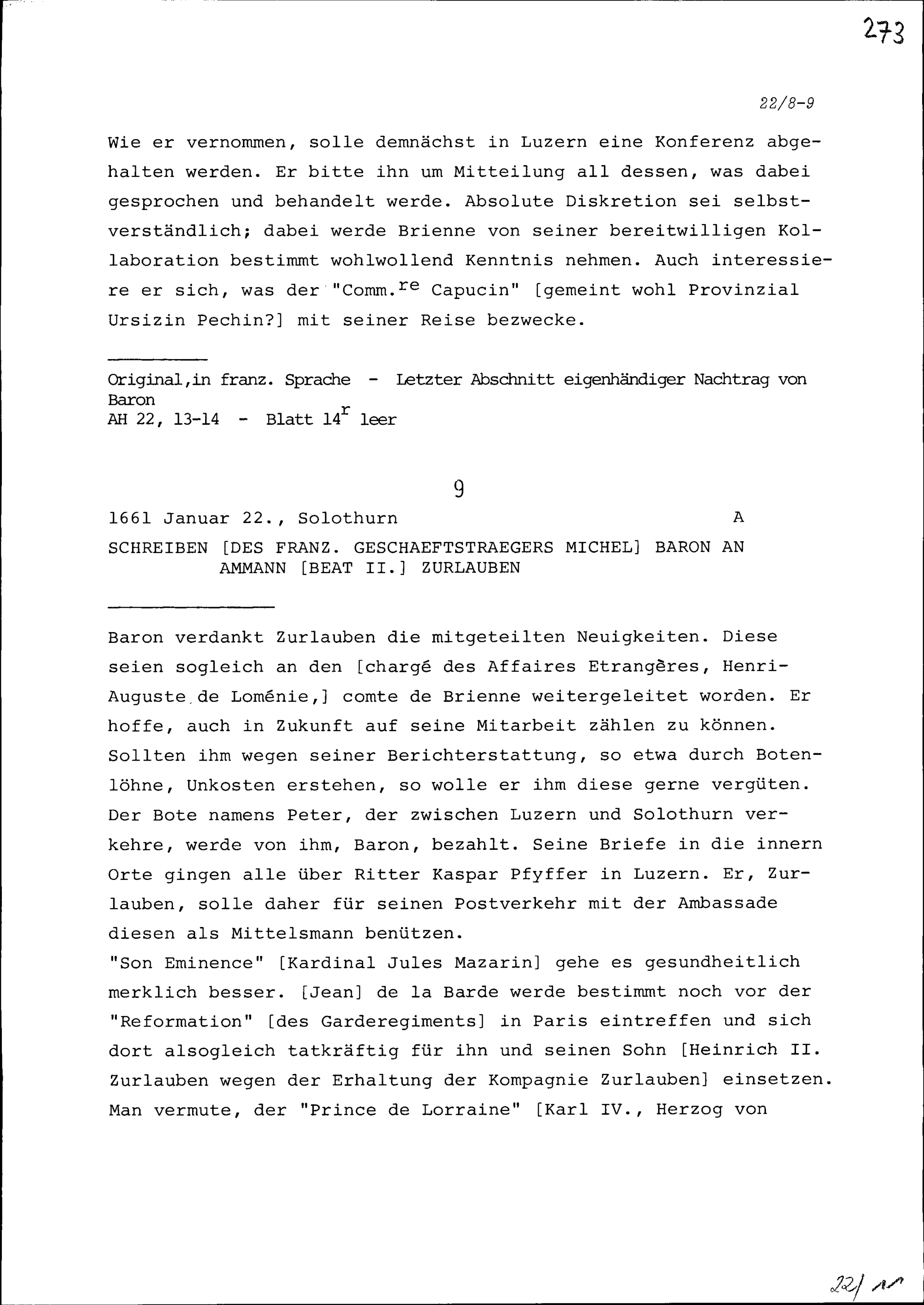 Schreiben von Michel Baron, französischer Geschäftsträger, an Beat II. Zurlauben,...