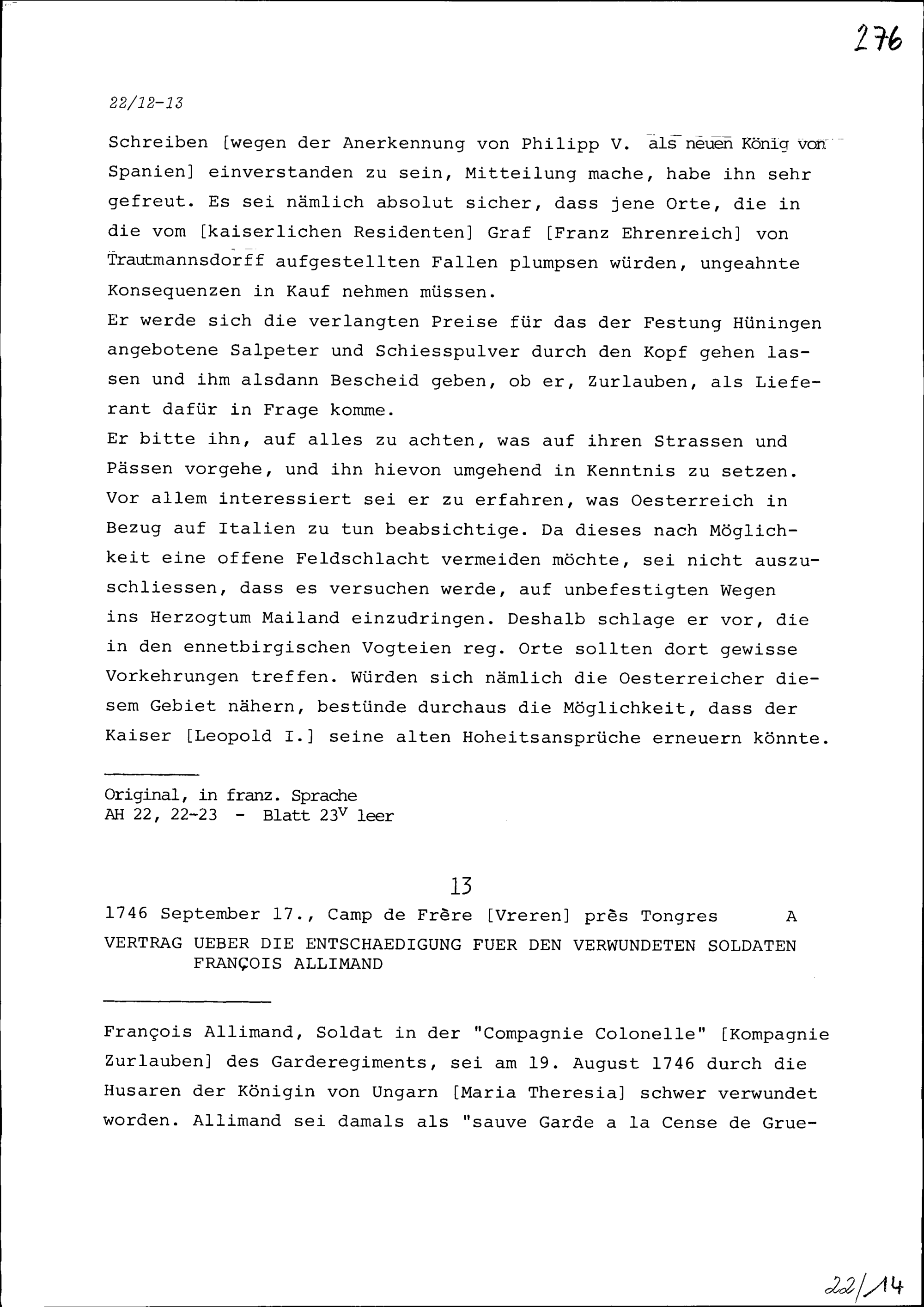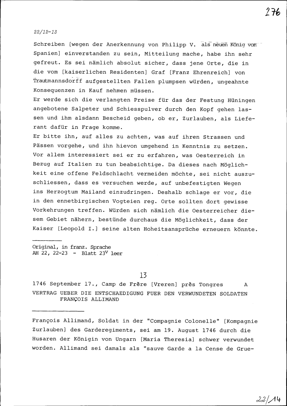 Vertrag über die Entschädigung für François Allimand, verwundeter Soldat