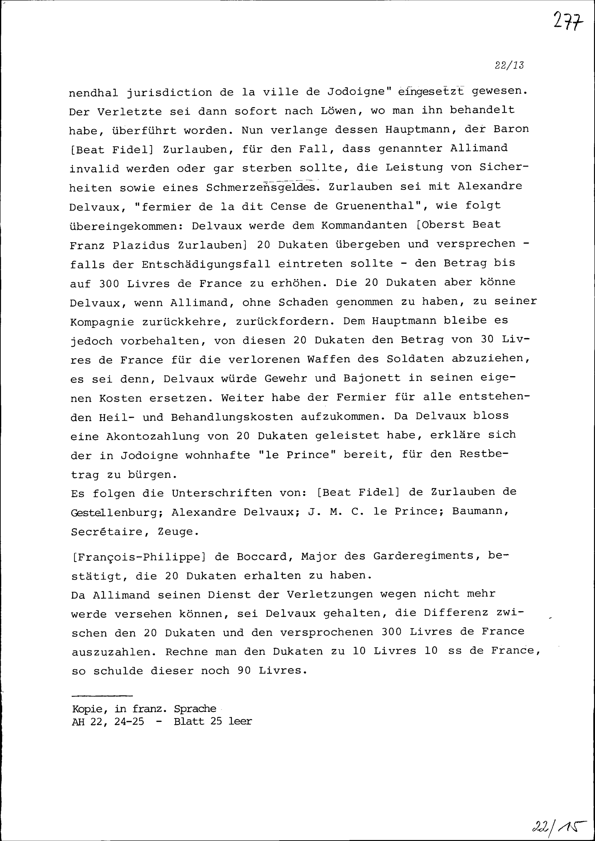 Vertrag über die Entschädigung für François Allimand, verwundeter Soldat