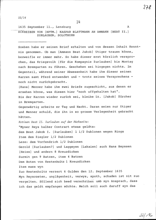 Schreiben von Kaspar Blattmann, Hauptmann, an Beat II. Zurlauben, Ammann, Solothurn