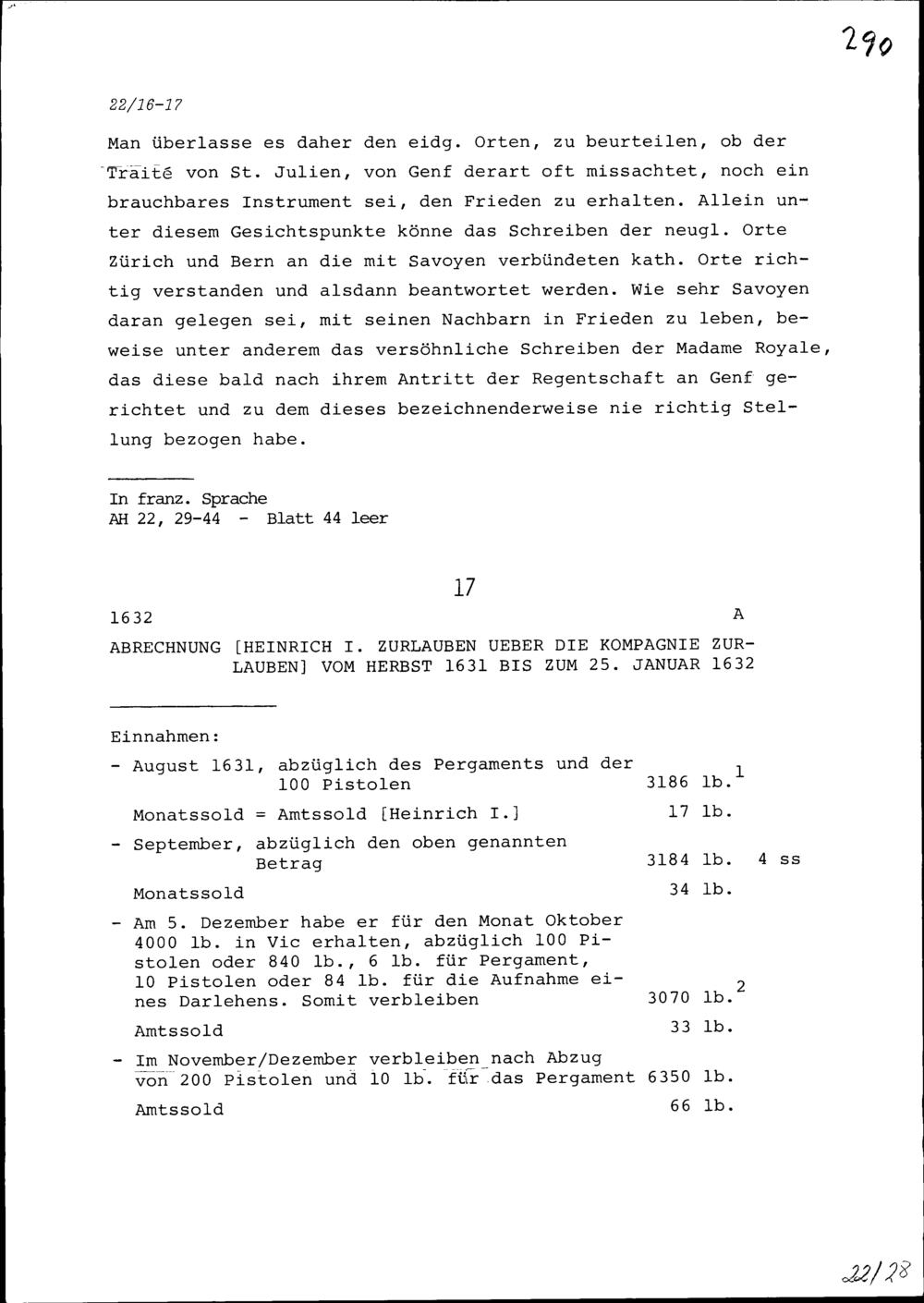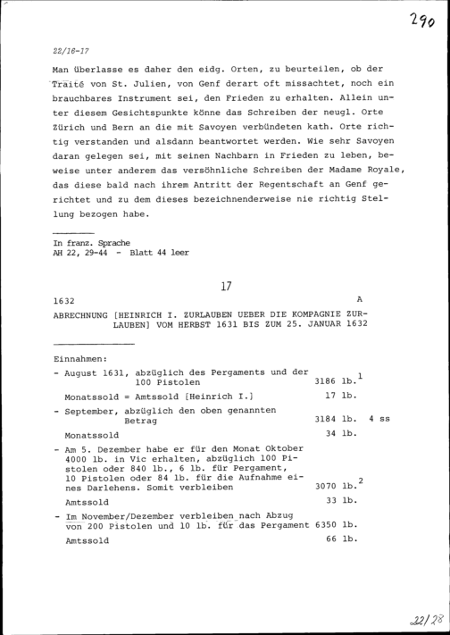 Abrechnung von Heinrich I. Zurlauben über die Kompanie Zurlauben vom Herbst 1631 bis zum 25. Januar 1632