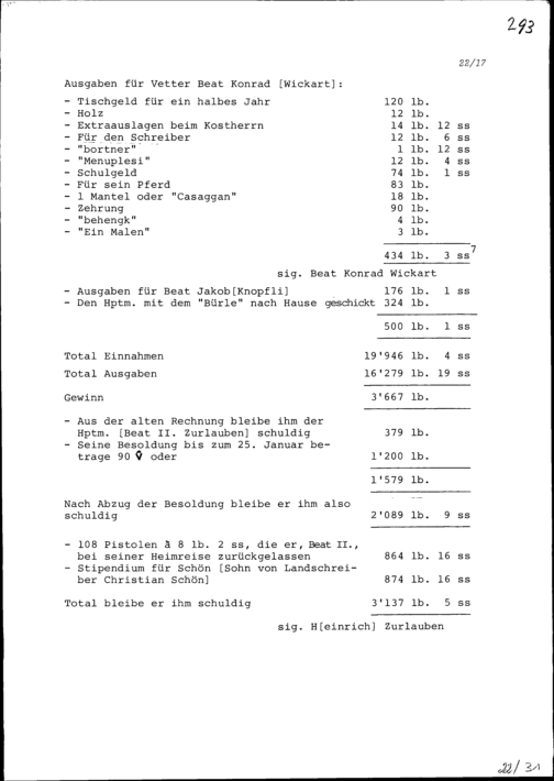 Abrechnung von Heinrich I. Zurlauben über die Kompanie Zurlauben vom Herbst 1631...