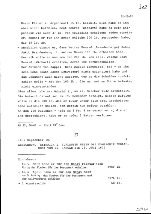 Abrechnung von Heinrich I. Zurlauben über die Kompanie Zurlauben vom 25. Januar bis 25. Juli 1632