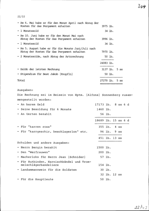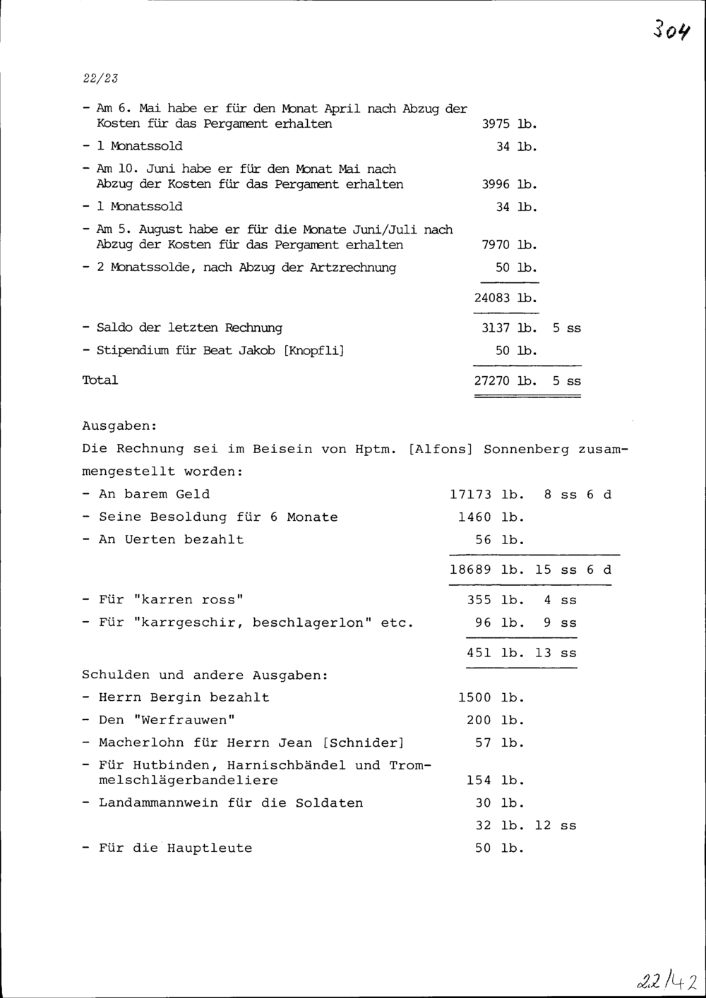 Abrechnung von Heinrich I. Zurlauben über die Kompanie Zurlauben vom 25. Januar bis 25. Juli 1632