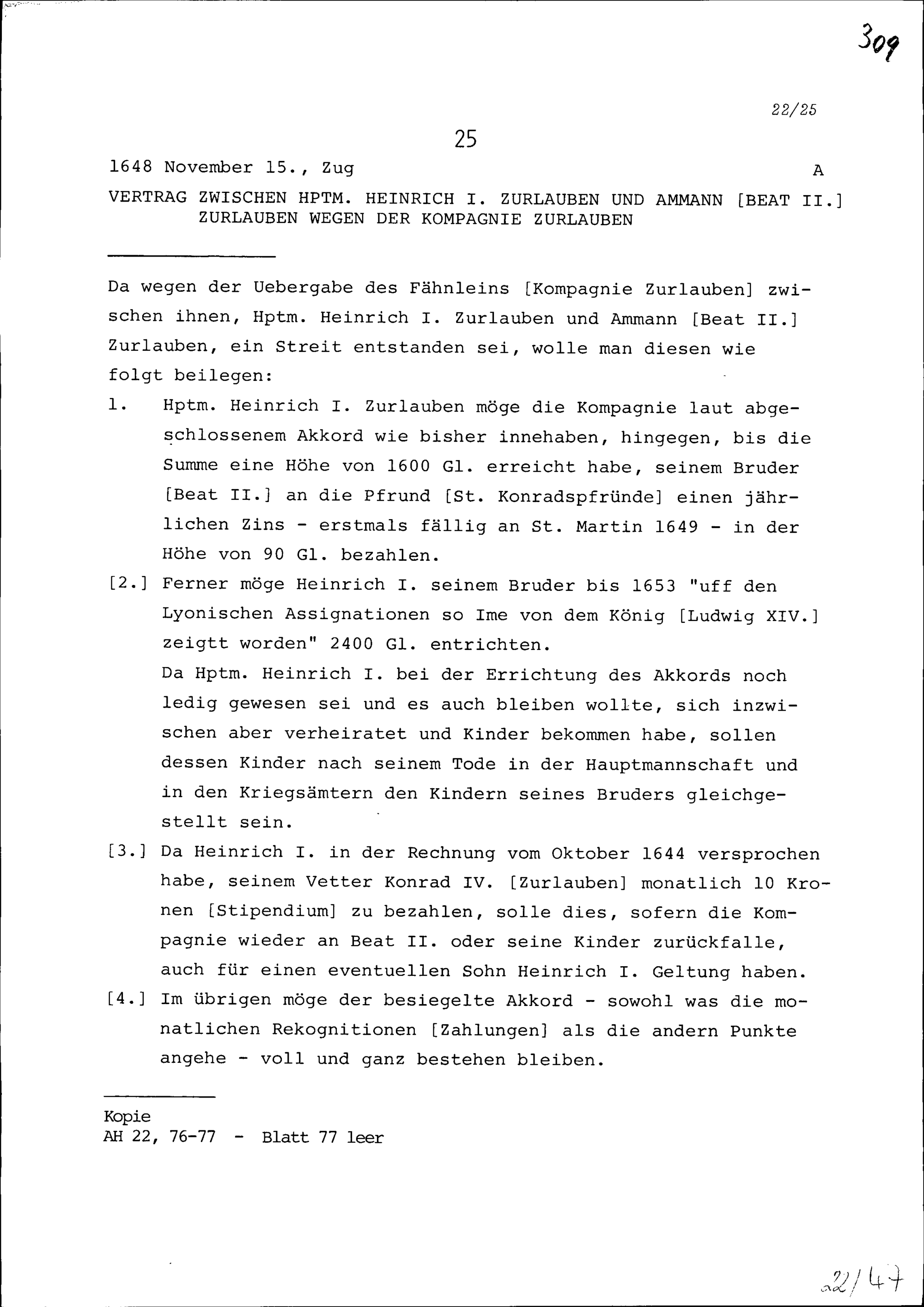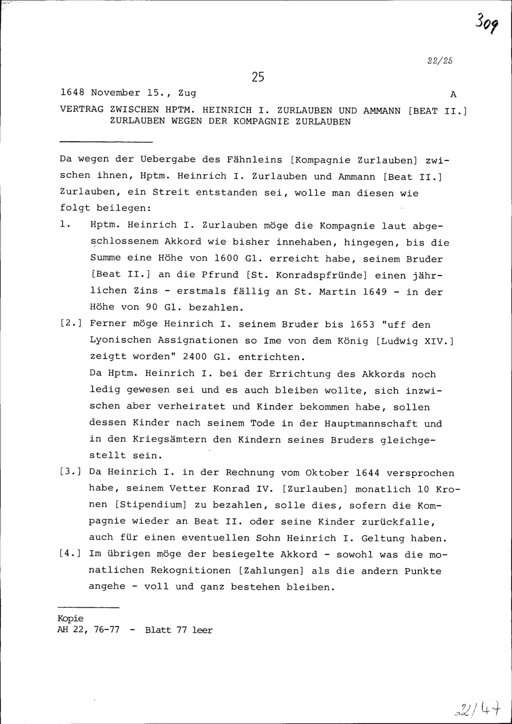 Vertrag zwischen Heinrich I. Zurlauben, Hauptmann, und Beat II. Zurlauben, Ammann, wegen der Kompanie Zurlauben