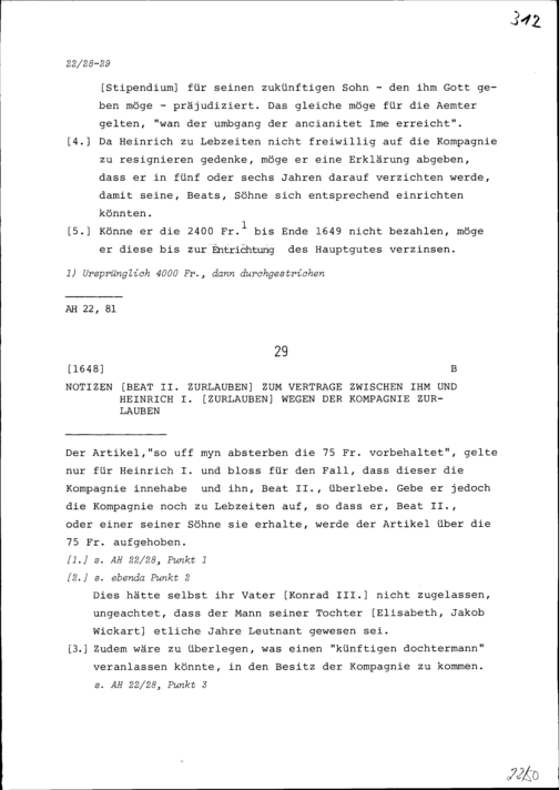 Notiz von Beat II. Zurlauben zum Vertrag zwischen ihm und Heinrich I. Zurlauben wegen der Kompanie Zurlauben