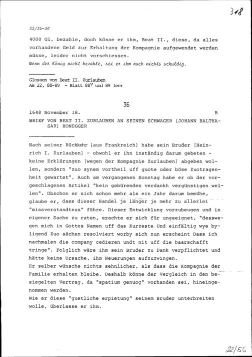 Schreiben von Beat II. Zurlauben an Johann Balthasar Honegger, Schwager