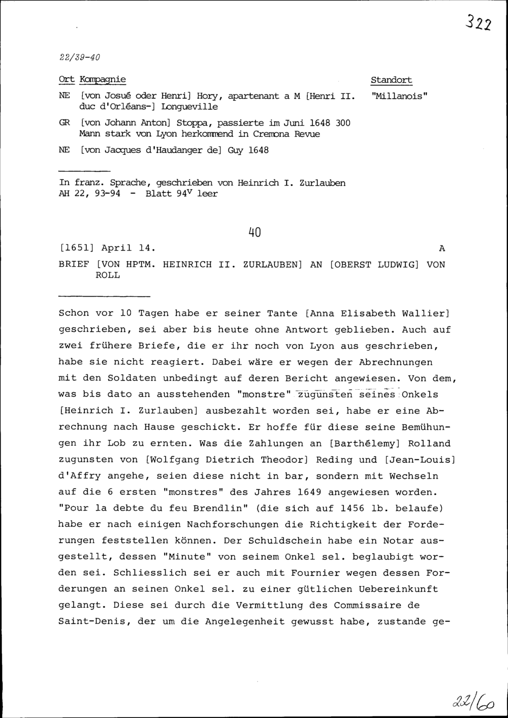 Schreiben von Heinrich II. Zurlauben, Hauptmann, an Ludwig von Roll, Oberst