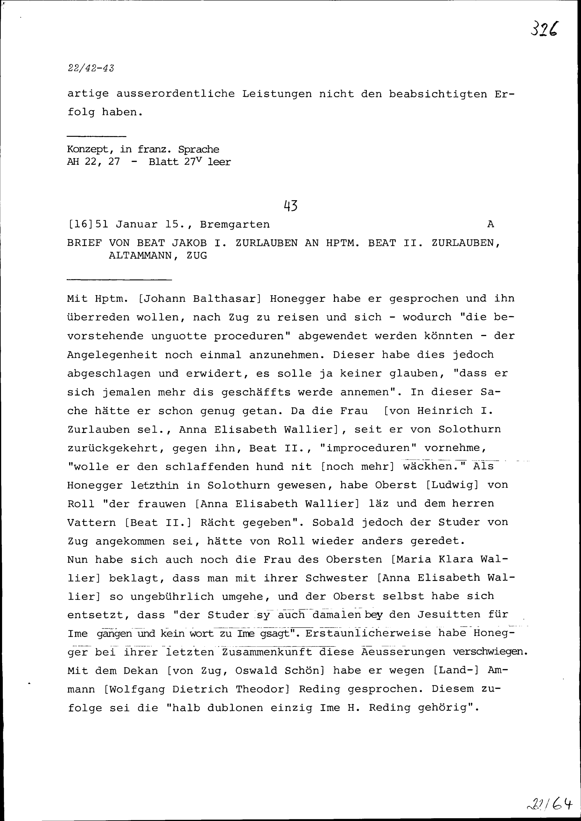 Schreiben von Beat Jakob I. Zurlauben an Beat II. Zurlauben, Hauptmann und Altammann, Zug