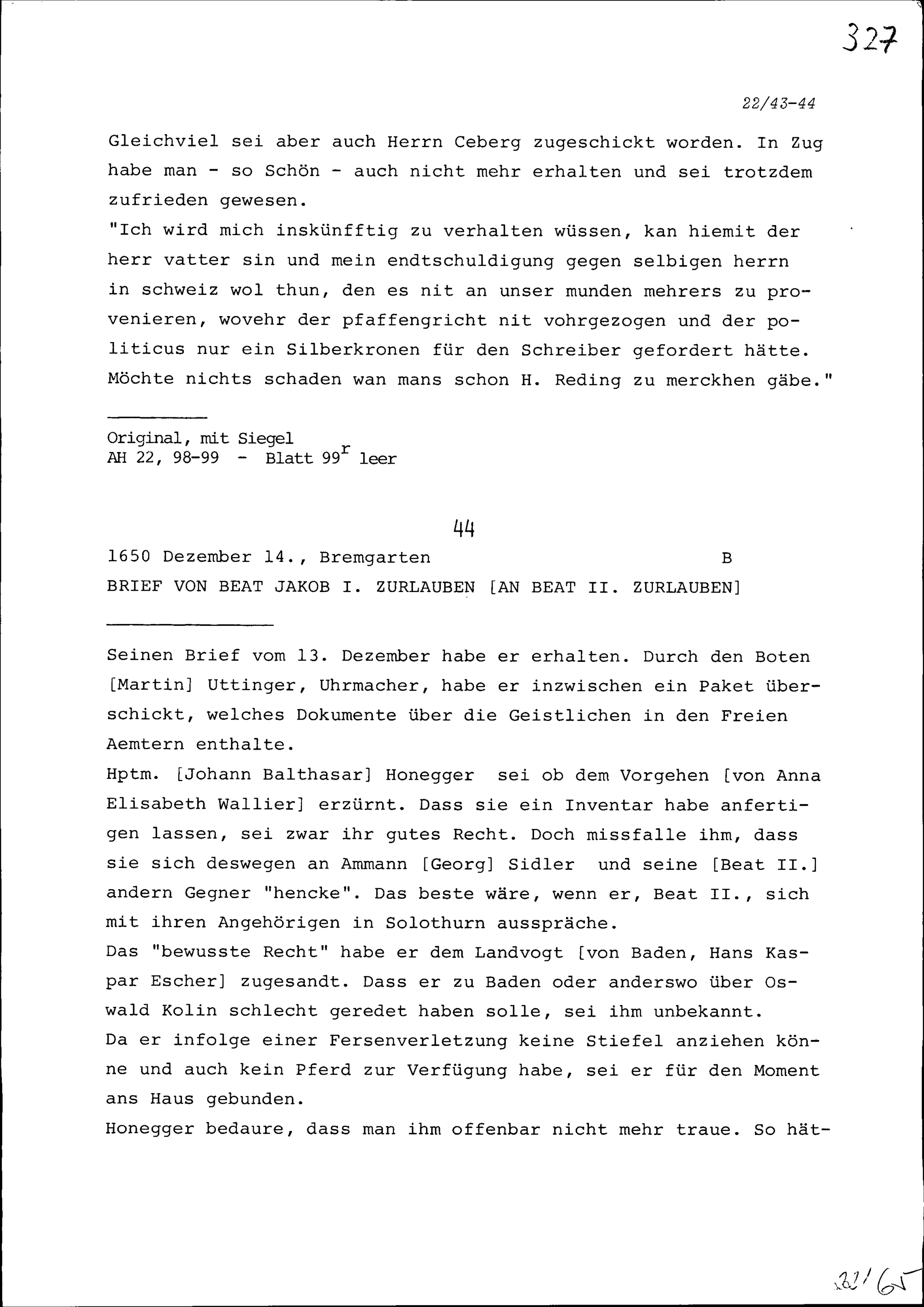 Schreiben von Beat Jakob I. Zurlauben an Beat II. Zurlauben