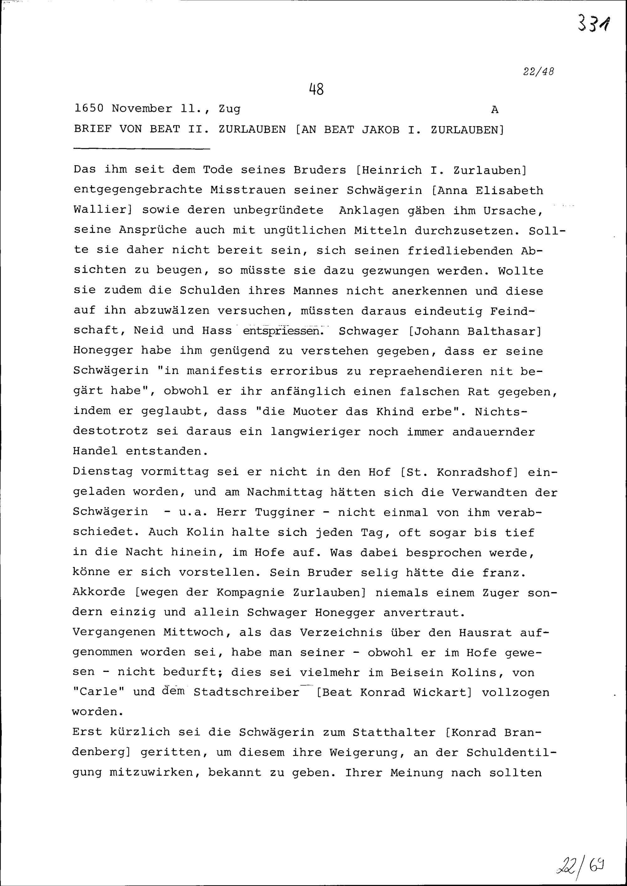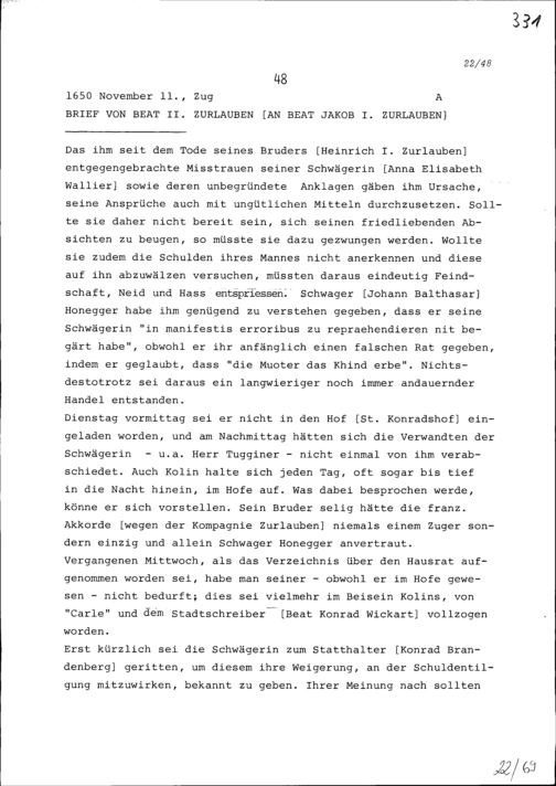 Schreiben von Beat II. Zurlauben an Beat Jakob I. Zurlauben