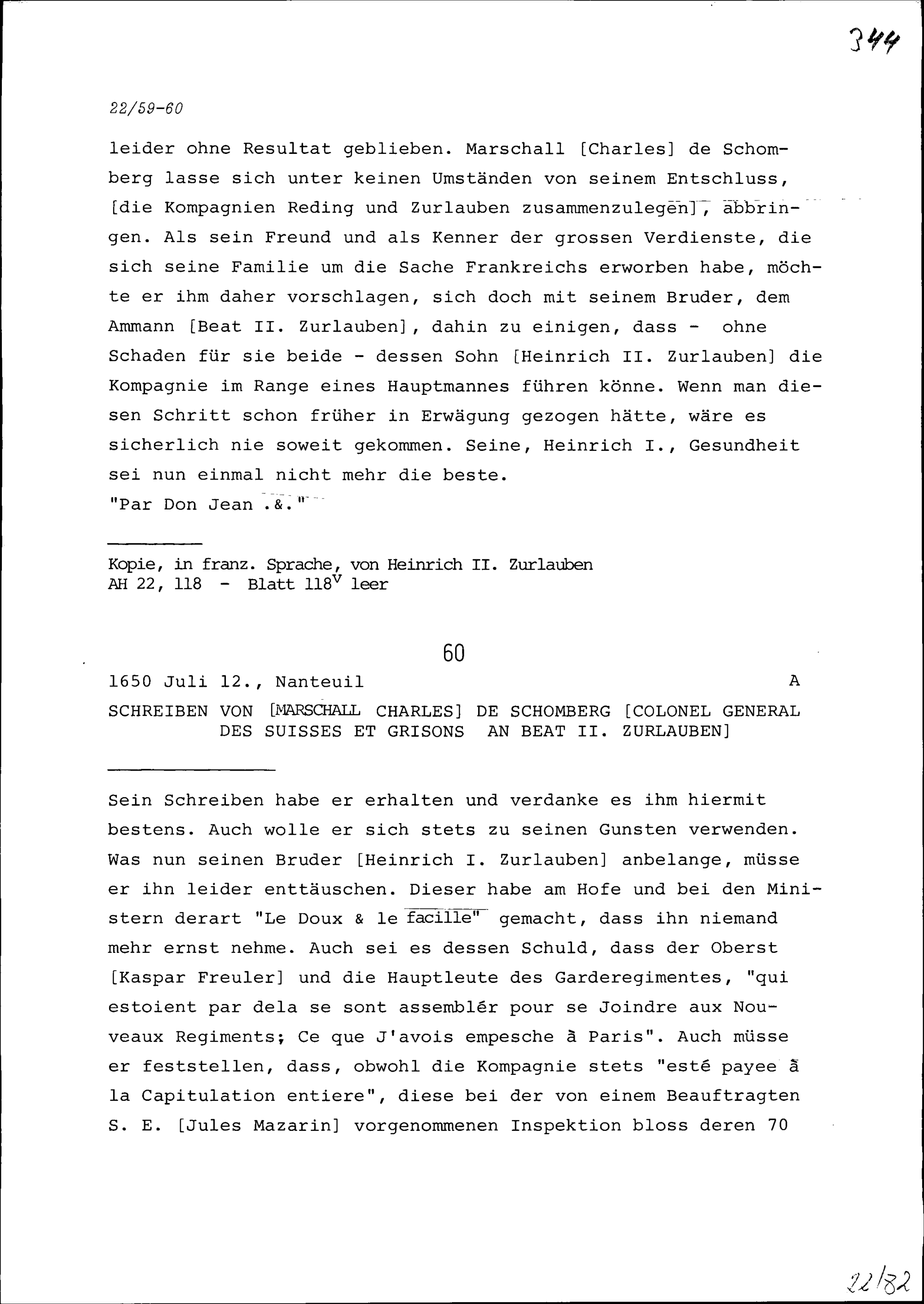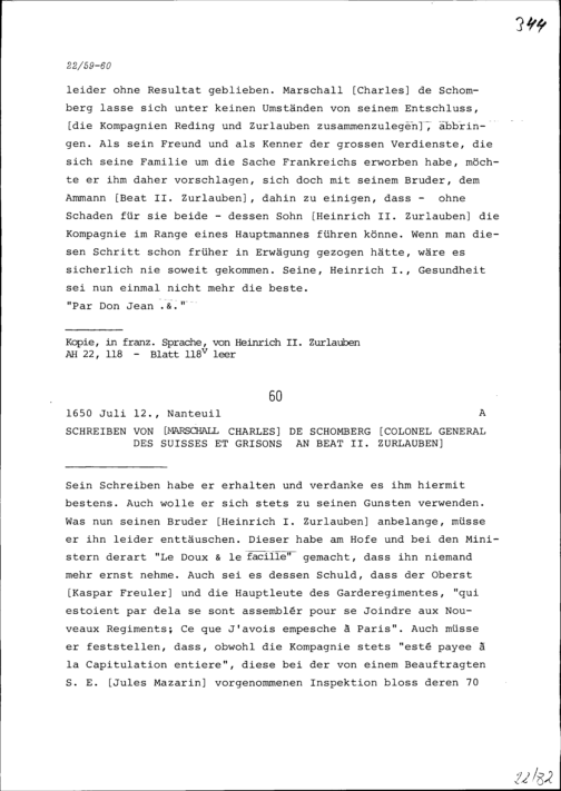 Schreiben von Karl von Schomberg, Marschall und Kommandant des Regiments der Schweizer und Bündner Garden, an Beat II. Zurlauben