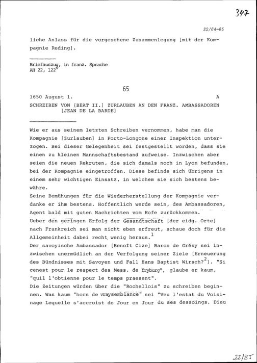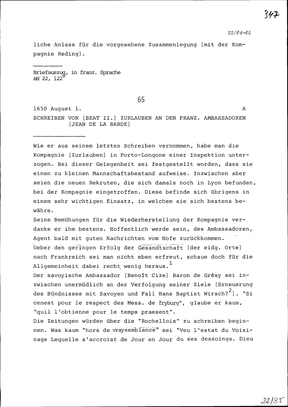 Schreiben von Beat II. Zurlauben an Jean de la Barde, Ambassador von Frankreich