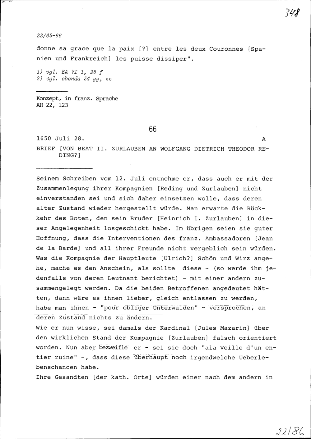 Schreiben von Beat II. Zurlauben an Wolfgang Dietrich Theodor Reding