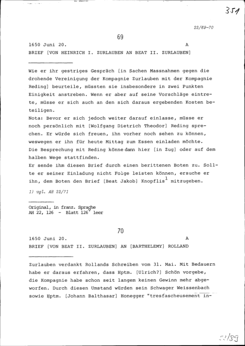 Schreiben von Heinrich I. Zurlauben an Beat II. Zurlauben
