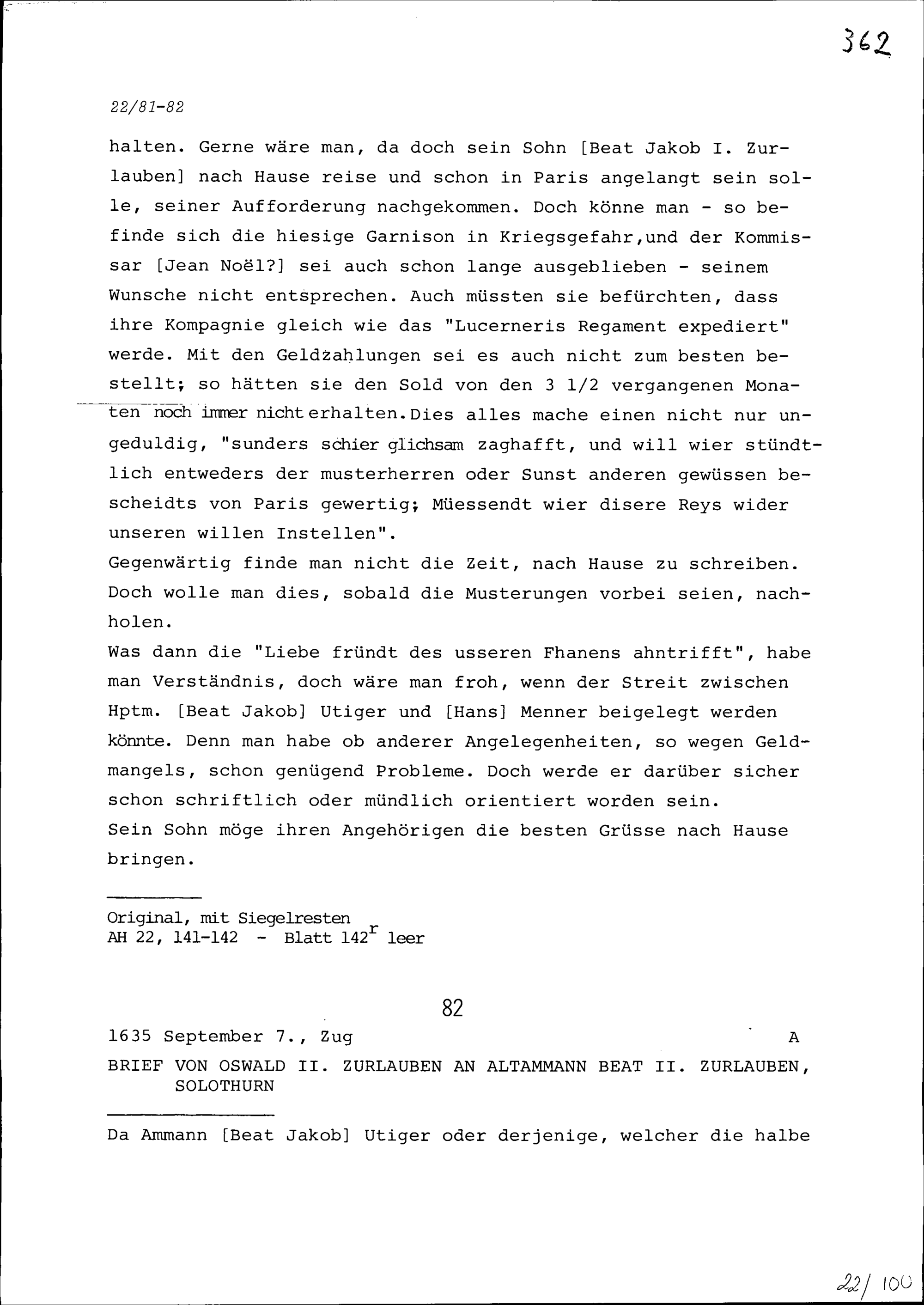 Schreiben von Oswald II. Zurlauben an Beat II. Zurlauben, Altammann, Solothurn