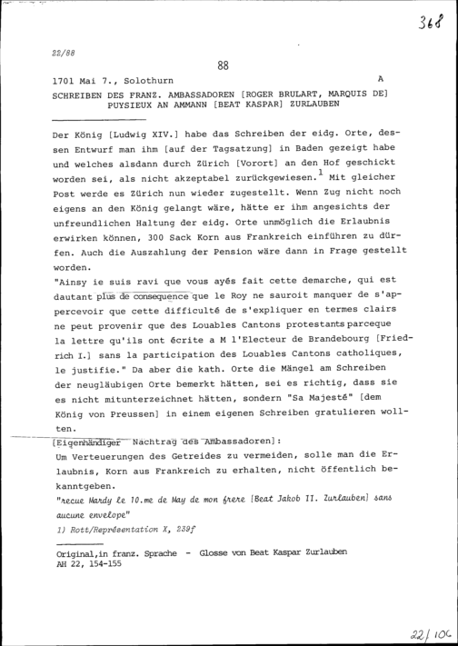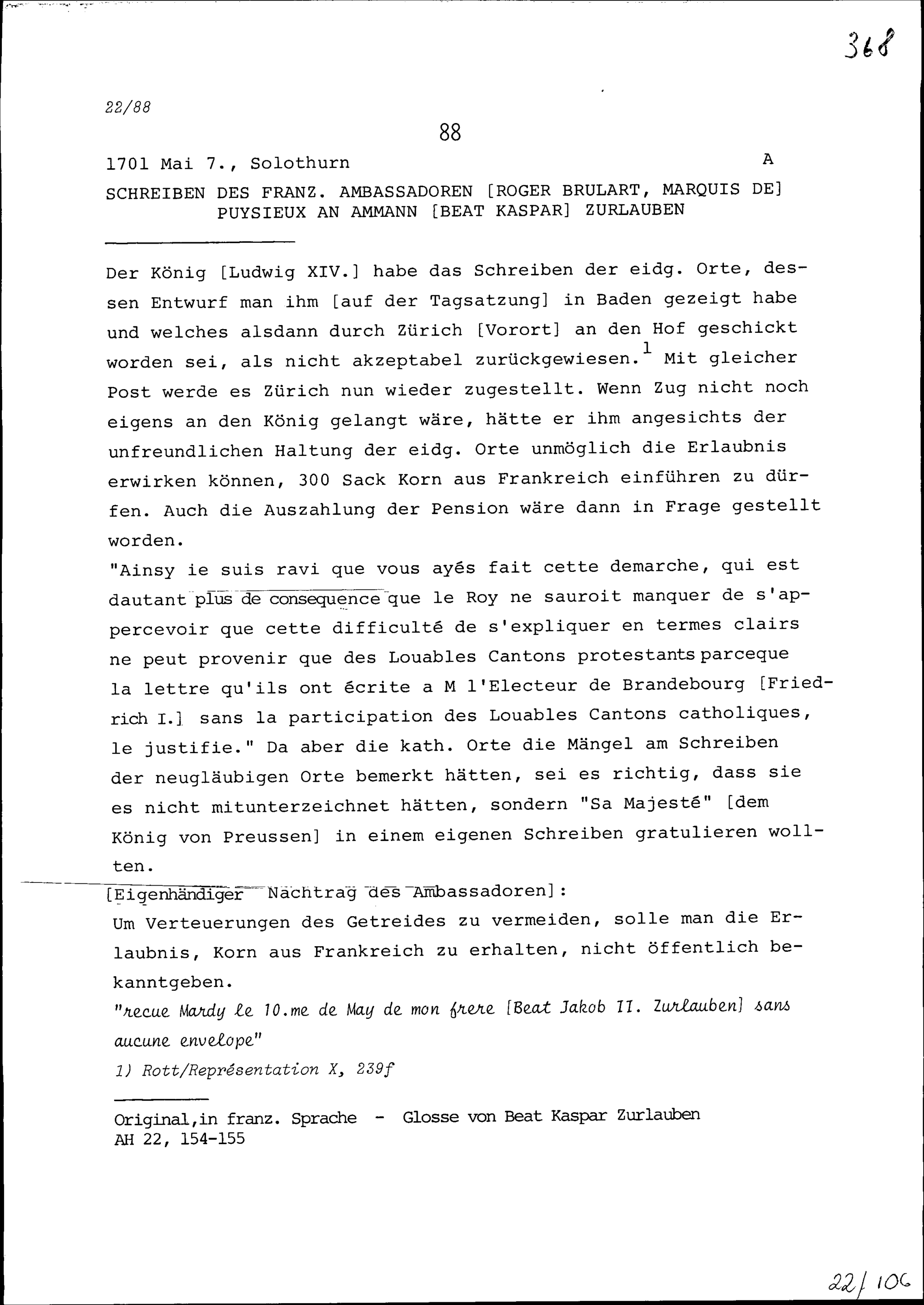 Schreiben von Roger Brûlart, Marquis de Puysieux, Ambassador von Frankreich, an Beat...