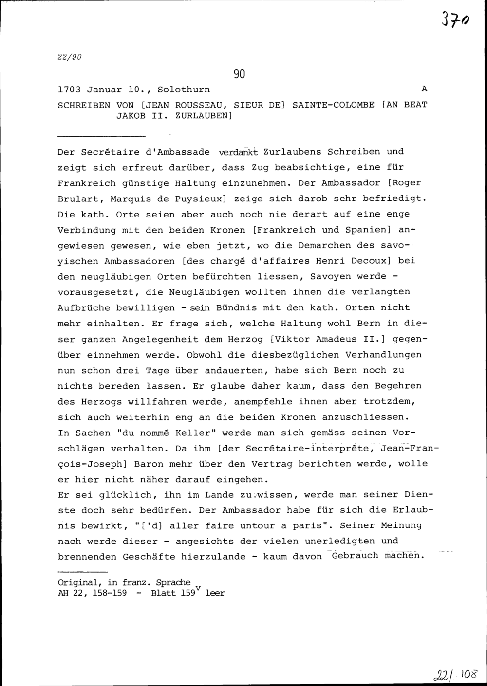 Schreiben von Jean Rousseau, Sieur de Sainte-Colombe an Beat Jakob II. Zurlauben