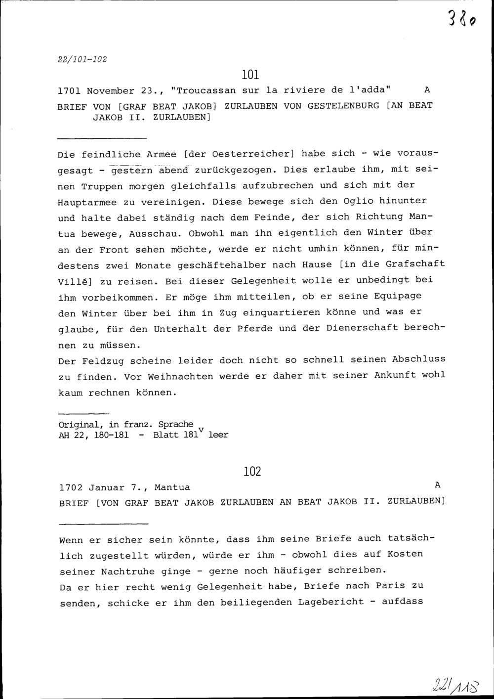 Schreiben von Beat Jakob Zurlauben an Beat Jakob II. Zurlauben