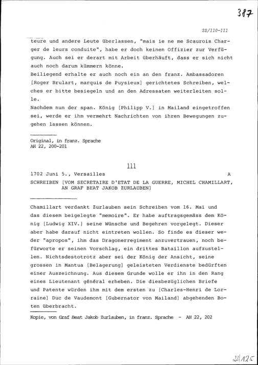 Schreiben von Michel Chamillart, Staatskriegsminister, an Beat Jakob Zurlauben