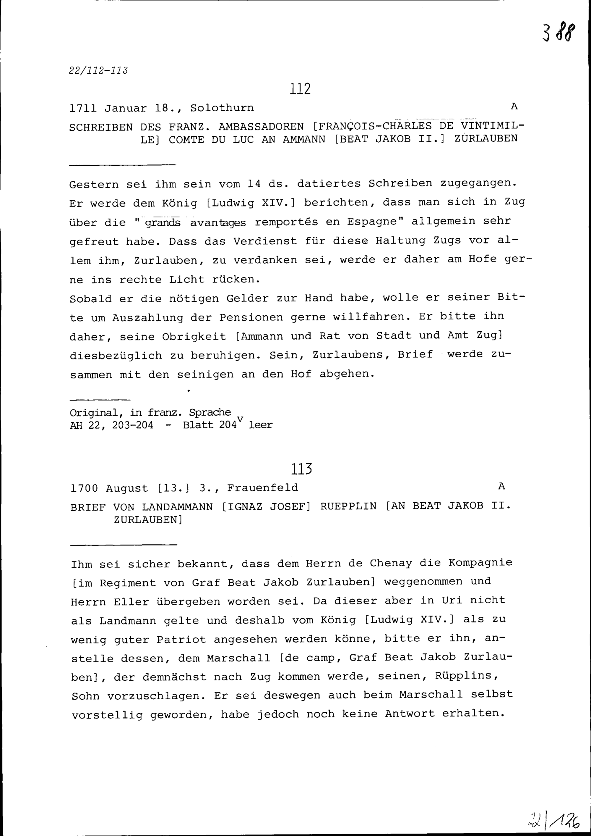 Schreiben von François-Charles de Vintimille Comte du Luc, Ambassador von Frankreich, an Beat Jakob II. Zurlauben, Ammann
