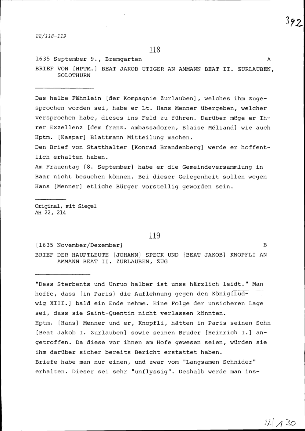 Schreiben von Beat Jakob Utiger, Hauptmann, an Beat II. Zurlauben, Ammann, Solot...