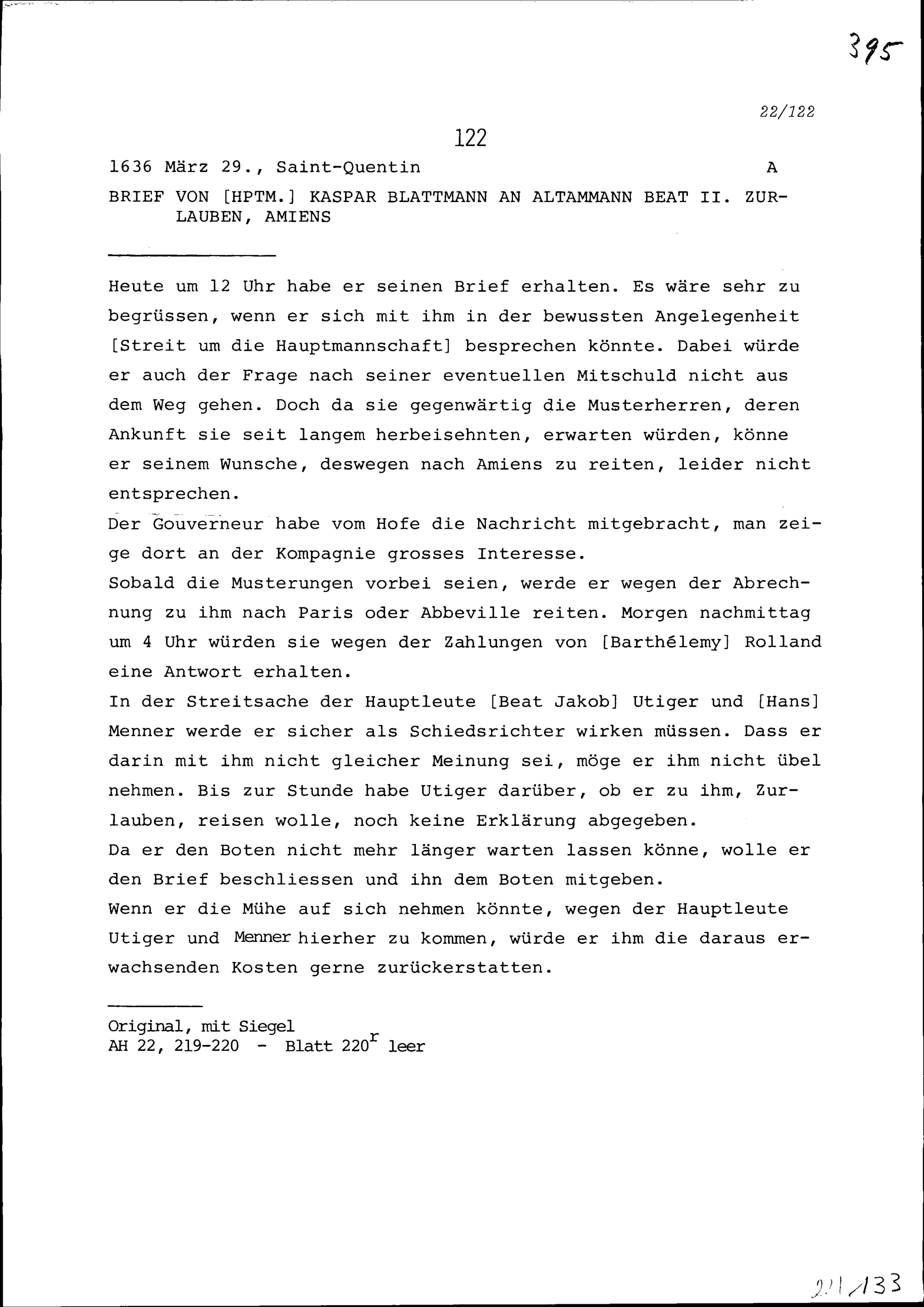 Schreiben von Kaspar Blattmann, Hauptmann, an Beat II. Zurlauben, Altammann, Amiens